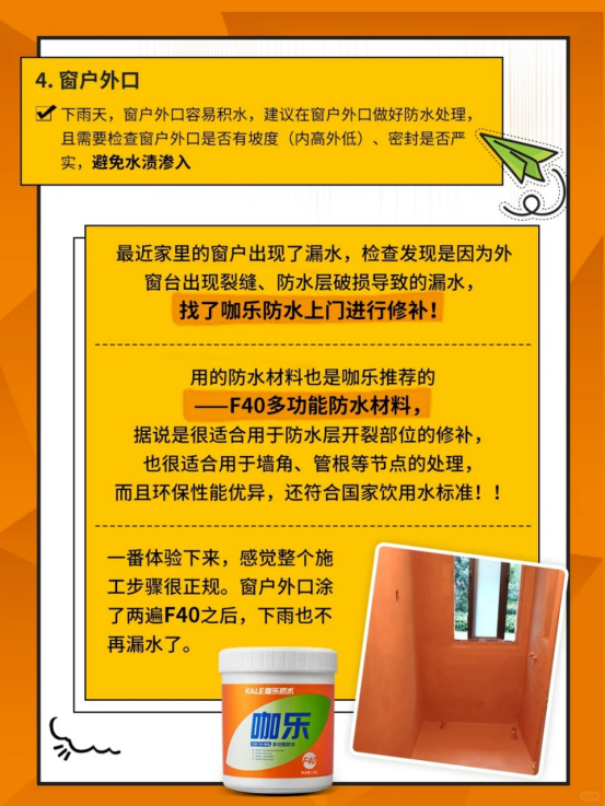 一番体验下来,感觉整个施工步骤很正规。窗户外口涂了两遍F40之后,下雨也不再漏水了。
