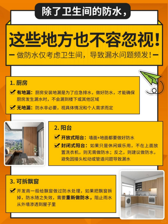 很多人在做防水时,仅考虑到了卫生间,住进去后才发现漏水问题频发!其实除了卫生间,这些地方的防水也不容忽视!!! 厨房